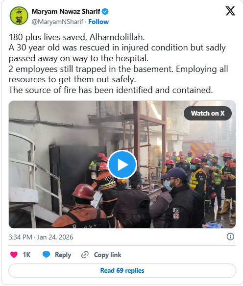 Punjab Chief Minister Maryam Nawaz said the fire was contained and emphasized the importance of proactive governance, writing, “The incident reaffirms a fundamental principle of governance: it must always be preemptive, not reactive.” She also confirmed that authorities rescued 180 people and relocated them to safe locations.