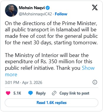 Interior Minister Mohsin Naqvi announced on Friday that all public transport in Islamabad will be free of charge for the next 30 days, following directives from Prime Minister Shehbaz Sharif. The announcement was shared on X, confirming that the initiative will benefit daily commuters starting tomorrow.