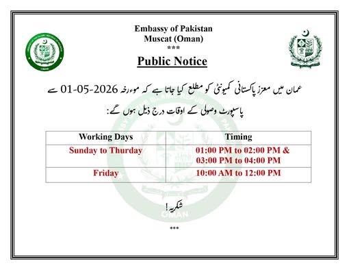 The Embassy of Pakistan in Muscat, Oman has officially updated its passport collection schedule through a public notice shared on social media. The revised timings will come into effect from 1 May 2026 and are aimed at improving and streamlining consular services for the Pakistani community living in Oman.