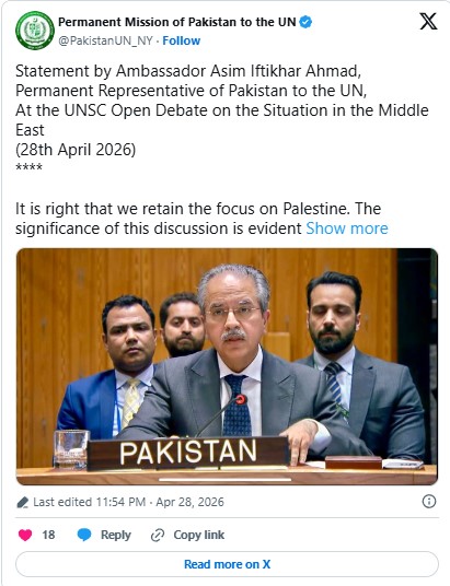 Reaffirming Pakistan’s position, he concluded that lasting peace in the Middle East depends on resolving the Palestinian question.