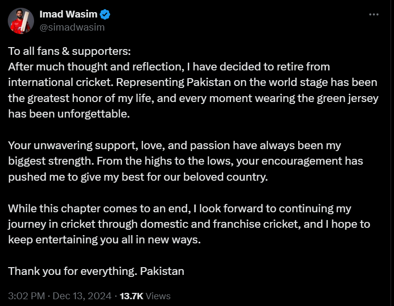 Imad Wasim made the announcement on Twitter stating that representing Pakistan on the world stage was the greatest honor of his life, and every moment wearing the green jersey has been unforgettable.