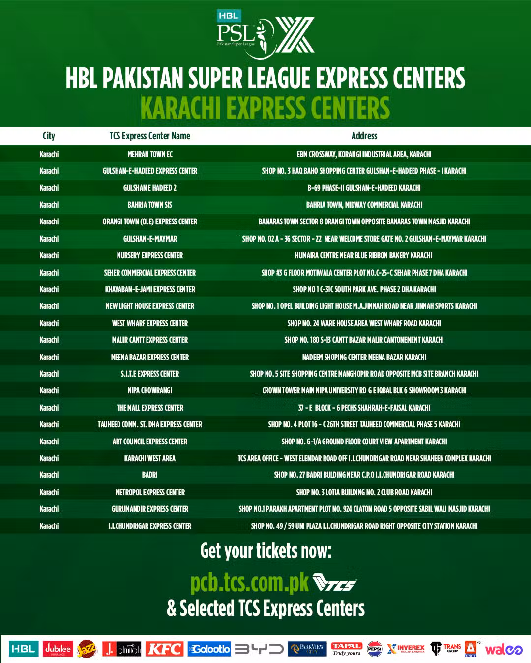 - Karachi: TCS Head Office, Dolmen Mall branches