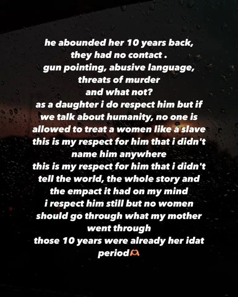 After receiving criticism, Feeya came forward with more details. She revealed that her father had left her mother over 10 years ago after years of abuse, including threats with a gun. Her mother had already lived through years of abandonment and trauma. So when the official divorce finally came, it felt like a victory, not a loss.