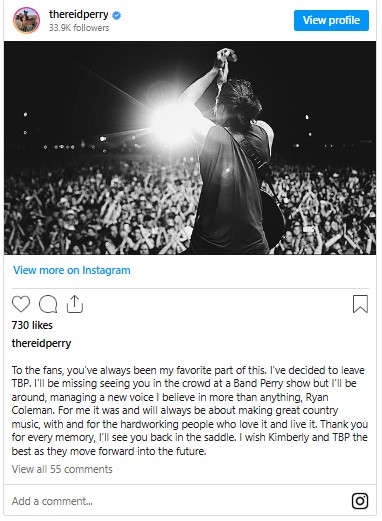 Reid’s sister and lead vocalist Kimberly Perry responded to his announcement with support and affection: