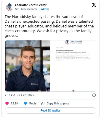 Daniel Naroditsky, the talented 29-year-old chess player, passed away on October 19, 2025, from unknown causes, a loss mourned by the global chess community. The Charlotte Chess Center announced his death via a statement on X (formerly Twitter), honoring him as a โcherished memberโ who inspired many with his passion and dedication to the game. The Saint Louis Chess Club also expressed their sorrow, remembering Naroditsky as a โgifted playerโ and a committed teacher who influenced countless players worldwide.