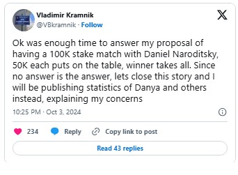 The dispute began in October 2024 when Kramnik posted on social media raising suspicions about Naroditskyโs gameplay, though without presenting concrete evidence. Kramnik challenged Naroditsky to a high-stakes match, writing, โOk was enough time to answer my proposal of having a 100K stake match with Daniel Naroditsky, 50K each puts on the table, winner takes all. Since no answer is the answer, lets close this story and I will be publishing statistics of Danya and others instead, explaining my concerns.โ