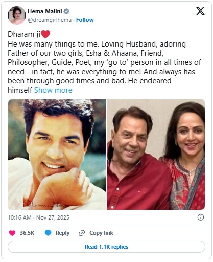 Three days after the nation mourned the loss of veteran star Dharmendra, his wife and iconic actress Hema Malini has spoken publicly for the first time. In an emotional message posted on Twitter, she expressed her deep love for the legendary actor.