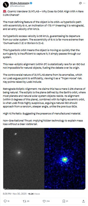 The hyperbolic nature of 3I/ATLAS means it is traveling so fast that it merely passes through the solar system, rather than being gravitationally bound. What has particularly intrigued astronomers is its near-ecliptic alignment—within 5°—which is statistically rare for an interstellar object, though not impossible for natural celestial bodies. This unusual alignment has fueled ongoing debates over its origin.
