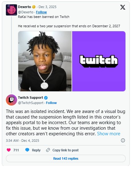 Twitch later clarified that the suspension period appearing online was due to a visual bug, and their team was working to resolve the issue.