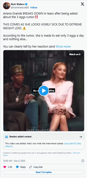 A viral video circulating online recently suggested that Ariana Grande cried during an interview after being asked about an alleged diet of three eggs a day. The clip, shared widely on X, sparked speculation among fans that the “Wicked” actress had been following such a restrictive regimen.