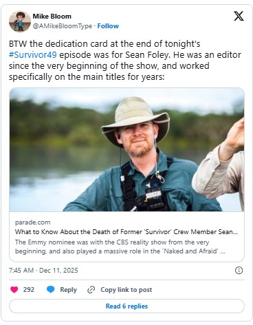The latest episode of Survivor 49, which aired on December 10, concluded with a heartfelt tribute to Sean Foley, a longtime member of the reality series’ production team, who passed away in November after a battle with brain cancer.