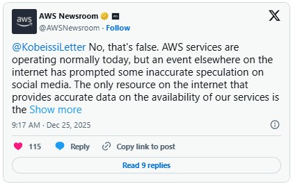 However, Amazon Web Services responded to the claims, stating, “@KobeissiLetter No, that’s false. AWS services are operating normally today, but an event elsewhere on the internet has prompted some inaccurate speculation on social media. The only resource on the internet that provides accurate data on the availability of our services is the #AWS Health Dashboard.”