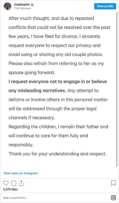 The announcement came after the retired player addressed the matter on Instagram, breaking his silence over the long-rumoured separation. Imad stated that the divorce followed “repeated conflicts that couldn’t be addressed over the past few years” and officially filed for separation, ending months of speculation.