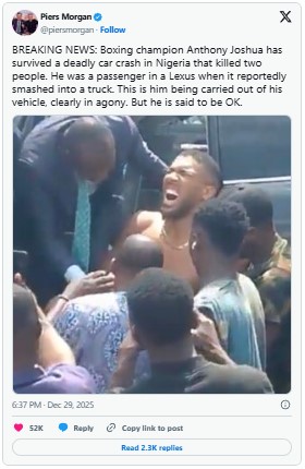 Media coverage, including posts by Piers Morgan on X, highlighted the gravity of the situation: “BREAKING NEWS: Boxing champion Anthony Joshua has survived a deadly car crash in Nigeria that killed two people. He was a passenger in a Lexus when it reportedly smashed into a truck. This is him being carried out of his vehicle, clearly in agony. But he is said to be OK.”