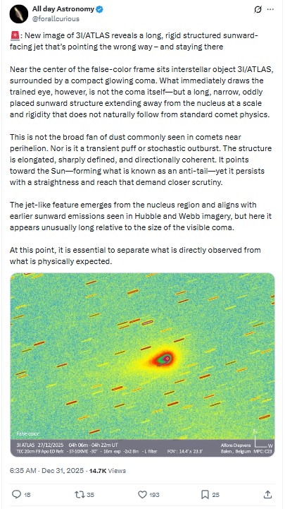 New Image of 3I/ATLAS Shows Mysterious Sunward Jet Pointing the Wrong Way