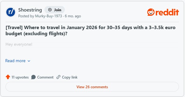 One Reddit user recently asked for advice on planning a 30-35 day trip with their girlfriend, with a budget of £2,600 to £3,000 for accommodation, food, transport, and activities (flights not included). Based in the Baltics, they were open to destinations across Asia, South America, Africa, Europe, or islands, seeking “good weather (ideally warm/sunny in Jan); a mix of nature, culture, and relaxation;” as well as “adventure,” such as “hiking, wildlife, or just exploring new places.”