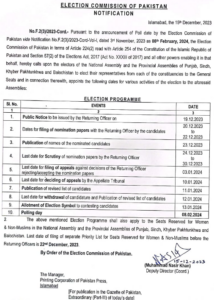 The Election Commission of Pakistan issued the schedule for February 8, 2024, as the date for the nationwide electoral process.