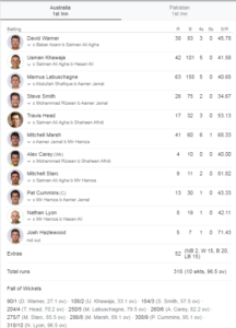 On second day, Australia lost seven wickets for 131 runs on the second morning and were all out for 318 in their first innings against Pakistan.