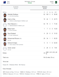 On 2nd day after Travis head was caught at slip via an out swining delivery of Shaheen Afridi for (17), aussies scrumble as Alex Carey (4) , Mitchell Starc (9). Apart from a fighting knock by Mitchell Marsh (40) on 60 balls , tail-enders Pat Cummins (13), Nathan Lyon (8) allowed Pakistan to start its first inning.