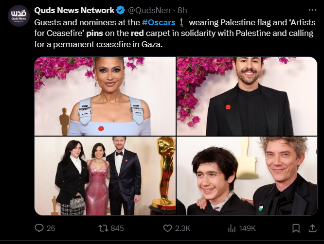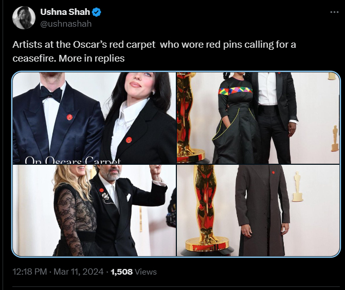 With all eyes on Oscar 2024, many celebrities wore red pins in support of the war-hit Palestine.