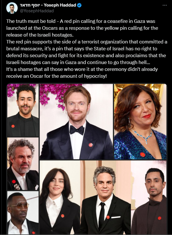 Billie Eilish, Ramy Youssef, Ava DuVernay and other celebrities wore red pins at the Oscars in support for a cease-fire in Gaza. The design featured a single hand holding a heart and was organized by the group Artists4Ceasefire. pic.twitter.com/sj6HBzsoYi