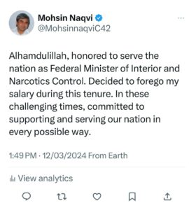 Taking to X, formerly known as twitter, newly sworn-in Interior Minister Mohsin Naqvi announced not to take his salary in view of the challenging times faced by the country.