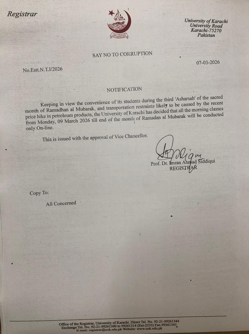 نوٹیفیکشن کے مطابق 9 مارچ سے رمضان المبارک کے اختتام تک جامعہ کراچی میں صبح کی کلاسز آن لائن ہوں گی۔ جامعہ کراچی انتظامیہ نے یہ فیصلہ طلبہ کی سہولت کے پیش نظرکیا ہے۔