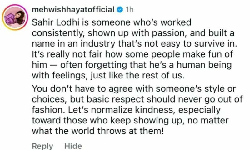 انہوں نے کہا کہ ساحر لودھی انڈسٹری کے ایک بہترین فنکار ہیں جنہوں نے اپنا نام بنانے میں بہت محنت کی ہے اور کسی کی محنت اور جدوجہد کا مذاق اُڑانا درست نہیں۔