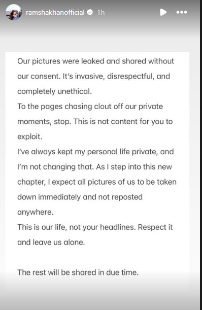 رمشا خان نے انسٹاگرام اسٹوری کے ذریعے واضح کیا کہ ان کی اجازت کے بغیر ان تصاویر کو شیئر کیا گیا۔ انہوں نے اس عمل کو غیر اخلاقی قرار دیا اور کہا کہ یہ ان کی ذاتی زندگی میں مداخلت ہے۔
