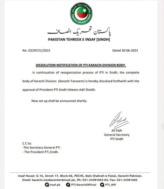 کراچی: پاکستان تحریک انصاف (پی ٹی آئی) کراچی ڈویژن کی تنظیم تحلیل کردی گئی، جس کا نوٹیفکیشن بھی جاری کردیا گیا۔
