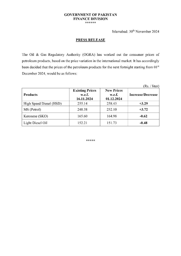 نوٹیفکیشن میں مزید کہا گیا ہے کہ آئل اینڈ گیس ریگولیٹری اتھارٹی نے عالمی مارکیٹ میں قیمتوں کے فرق کی بنیاد پر پیٹرولیم مصنوعات کے صارفین کی قیمتوں پر کام کیا ہے۔