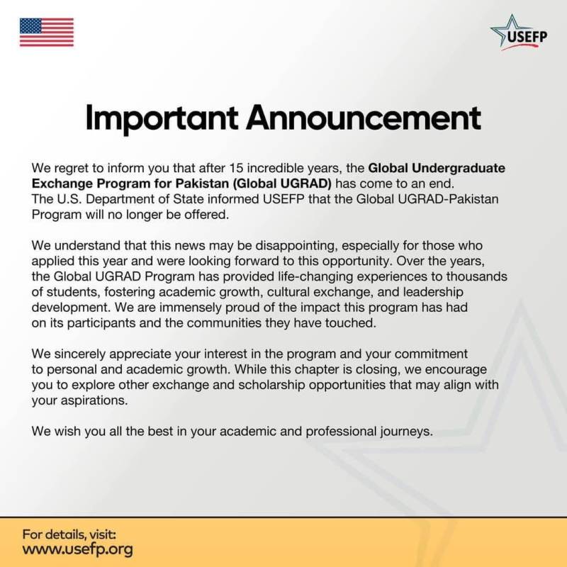یہ اعلان پاکستان میں امریکی تعلیمی فاؤنڈیشن نے کیا اور کہا کہ 15 شاندار برس کے بعد اب یہ پروگرام مزید پیش نہیں کیا جائےگا،