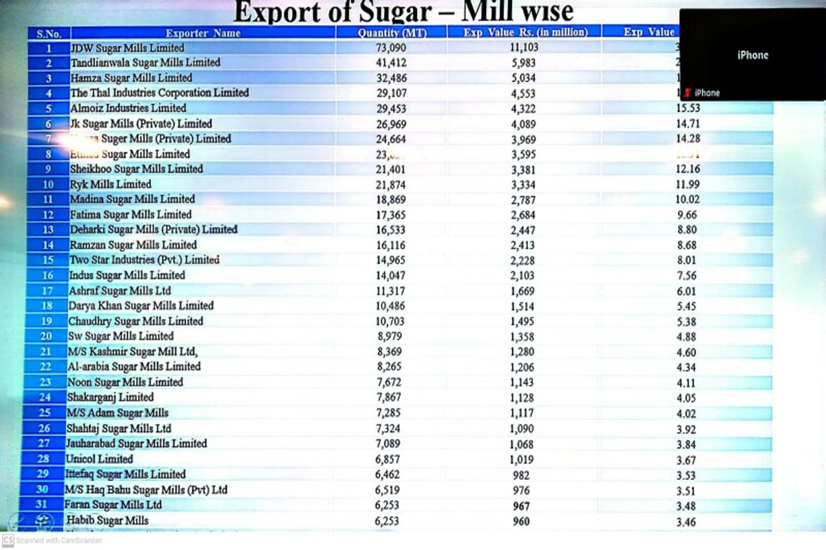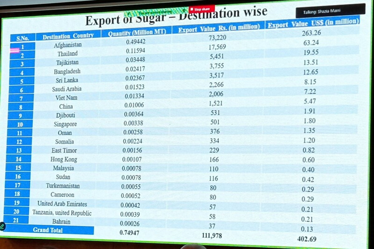بریفنگ کے مطابق گزشتہ برس 40 کروڑ ڈالر مالیت کی 7 لاکھ 49 ہزار ٹن چینی برآمد کی گئی، جس میں سے سب سے زیادہ یعنی 4 لاکھ 94 ہزار ٹن چینی افغانستان کو بھیجی گئی۔ سب سے زیادہ چینی جے ڈی ڈبلیو شوگر مل نے برآمد کی۔
