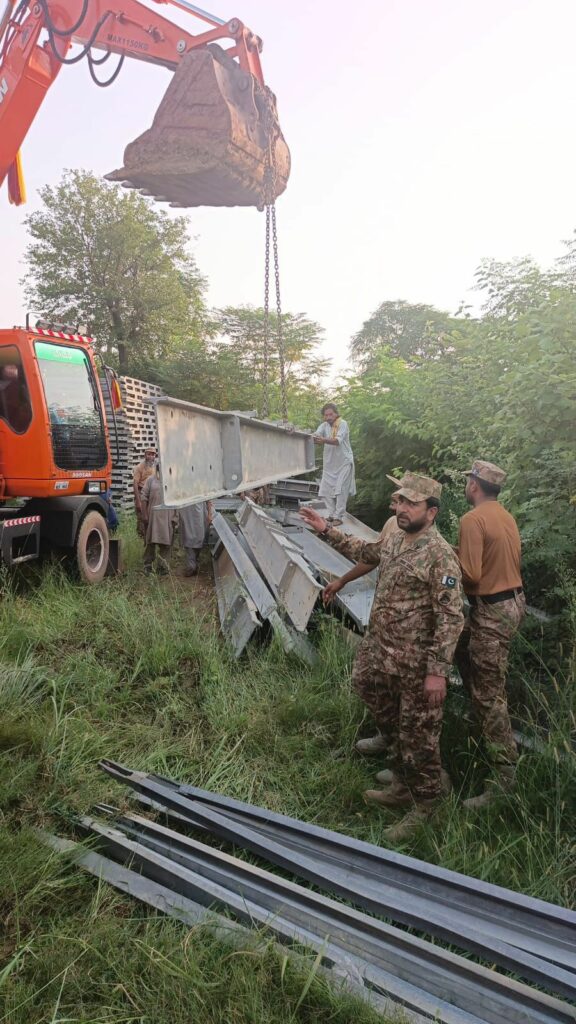 پاک فوج نے باجوڑ اور دیر کو ملانے والے انتہائی اہم پُل کے سیلاب میں بہہ جانے کے بعد نئے پُل کی تنصیب کے لیے کام شروع کر دیا۔