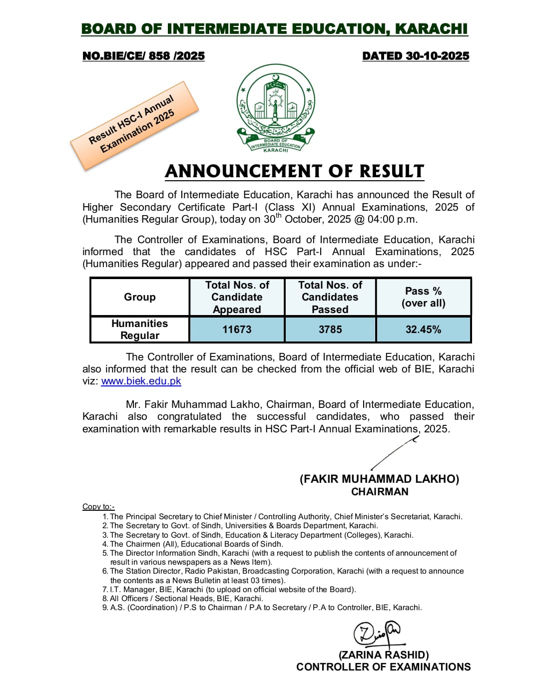 اعلیٰ ثانوی بورڈ نے آرٹس ریگولر پارٹ ون کے سالانہ نتائج 2025 کا اعلان کردیا۔