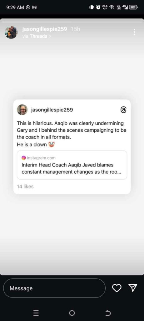 جیسن گیلسپی کا کہناتھا کہ عاقب جاوید واضح طور پر گیری کرسٹن اور میری ساکھ کو نقصان پہنچا رہے تھے، عاقب جاوید تمام فارمیٹس میں کوچ بننے کے لئے ہمارے پیچھے کیمپین کر رہے تھے، ان کاکہناتھا کہ عاقب جاوید ایک جوکر ہے