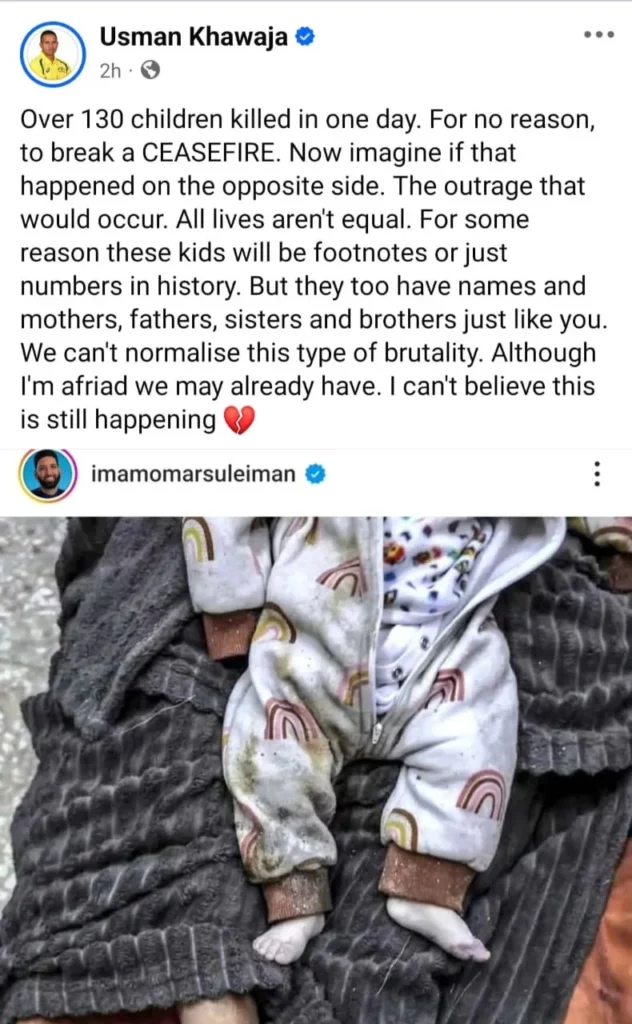 آسٹریلوی کرکٹر عثمان خواجہ نے سوشل میڈیا پر جاری پیغام میں لکھا کہ ’ایک دن میں 130 سے زائد بچے شہید کیے گئے اور بغیر کسی وجہ کے جنگ بندی کو توڑا گیا ہے‘۔
