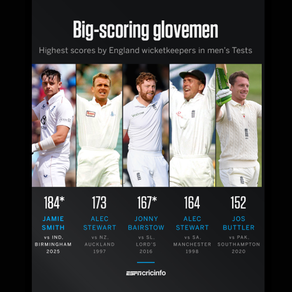 اس شاندار اننگز کے ساتھ جیمی اسمتھ نے انگلینڈ کے لیے نئی تاریخ رقم کی۔ 24 سالہ جیمی اسمتھ ٹیسٹ کرکٹ میں انگلینڈ کی جانب سے سب سے بڑی انفرادی اننگز کھیلنے والے وکٹ کیپر بیٹر بن گئے۔
