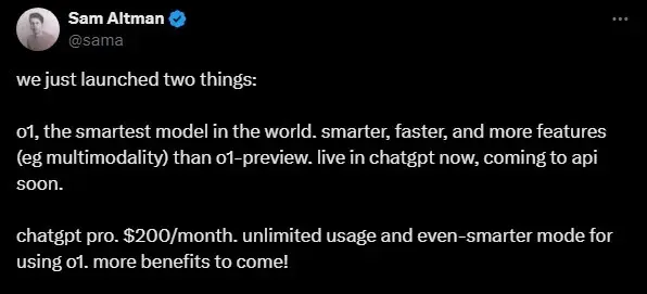 اوپن اے آئی کے سی ای او سیم آلٹ مین نے ایکس پر نئے ورژن کے اجراء کا اعلان کرتے ہوئے کہا کہ ہم نے او 1 نامی دنیا کا سب سے اسمارٹ ماڈل لانچ کیا ہے جو او 1-پری ویو کے مقابلے میں اسمارٹ، تیز اور زیادہ خصوصیات کا حامل ہے۔