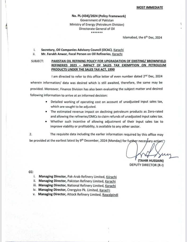 ذرائع نے کہا کہ خصوصی سرمایہ کاری سہولت کونسل (ایس آئی ایف سی) کی ایپکس کمیٹی نے بھی ریفائنری پالیسی پر تاخیر پر رپورٹ طلب کرلی ہے جس کا اجلاس 11 دسمبر کو طلب کیے جانے کا امکان ہے۔