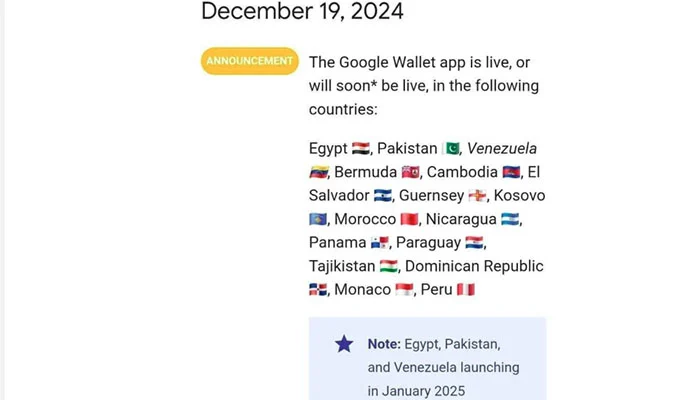 گوگل کی جانب سے یہ ادائیگی کا نظام جنوری 2025 میں پاکستان میں متعارف کرائے جانے کا امکان ہے جو ڈیجیٹل ادائیگیوں کے حوالے سے ایک اہم پیش رفت ثابت ہوگا۔