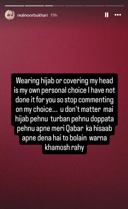 سوشل میڈیا صارفین کی تنقید کے بعد اداکارہ نے کمنٹس کا سلسلہ ہی بند کردیا اور انسٹاگرام اسٹوری کے ذریعے ناقدین کو جواب دیا کہ میں حجاب پہنوں، پگڑی پہنوں یا دوپٹہ یہ آپ کا مسئلہ نہیں، اگر میری قبر کا حساب آپ نے دینا ہے تو بولیں ورنہ خاموش رہیں۔