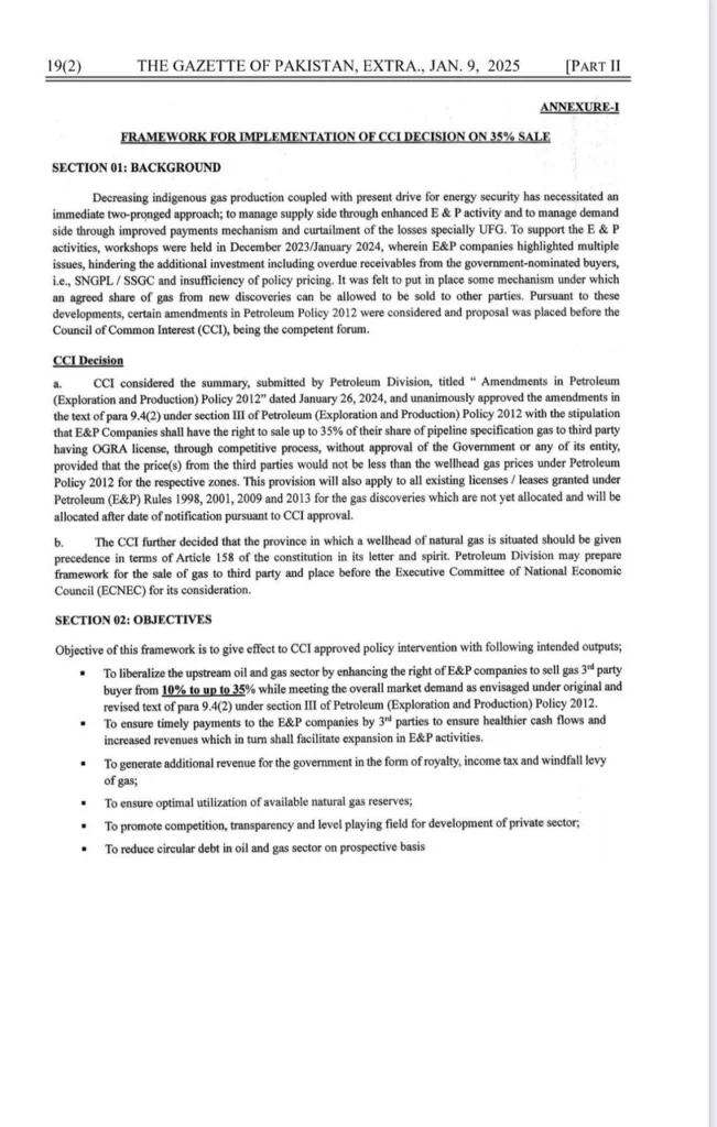 وزارت توانائی نے گیس پیداواری کمپنیوں کو 35 فیصد گیس نجی کمپنیوں کو بیچنےکا گزٹ نوٹیفکیشن جاری کردیا۔