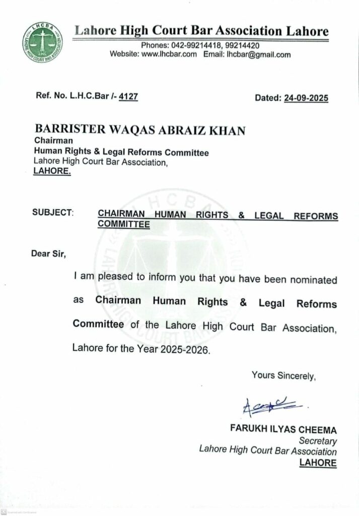 لاہور ہائی کورٹ بار ایسوسی ایشن نے بیرسٹر وقاص ابریز خان کو ہائی کورٹ بار کی ہیومن رائٹس کمیٹی پنجاب کا چیئرمین نامزد کر دیا۔