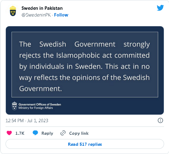 پاکستان میں سویڈن کے سفارت خانے کی جانب سے اپنی گورنمنٹ کا بیان ٹوئٹر پر پوسٹ کیا گیا ہے جس میں کہا گیا ہے کہ سویڈش حکومت اسلاموفوبیا پر مبنی اس عمل کو سختی سے مسترد کرتی ہے، یہ واقعہ سویڈن کی حکومت کا موقف واضح نہیں کرتا ہے۔