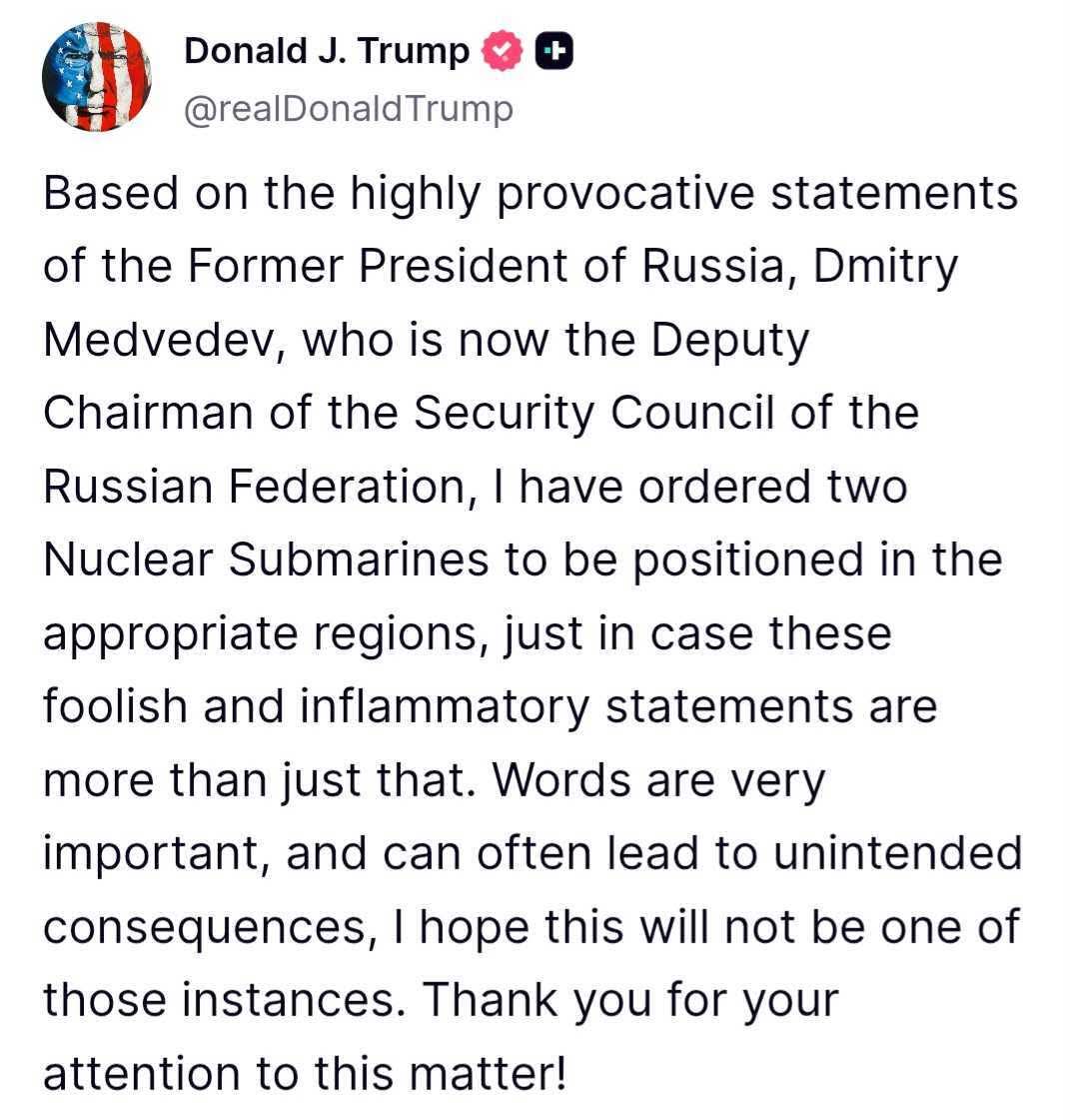 سماجی رابطےکے پلیٹ فارم ٹروتھ سوشل میں اپنے بیان میں ٹرمپ نے کہا کہ انھوں نے روس کے سابق صدر اور روس کی سیکیورٹی کونسل کے موجودہ سربراہ دمتری میدویدیف کے ’اشتعال انگیز‘ بیانات کے ردعمل میں 2 جوہری آبدوزوں کو ’مناسب علاقوں‘ میں متعین کرنے کا حکم دے دیا ہے تاکہ اگر یہ بیانات محض الفاظ سے بڑھ کر کچھ نکلیں تو امریکا اس کے لیے تیار ہو۔
