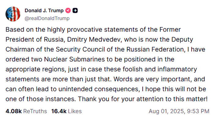 سماجی رابطےکے پلیٹ فارم ٹروتھ سوشل میں اپنے بیان میں ٹرمپ نے کہا کہ انہوں نے روس کے سابق صدر اور روس کی سکیورٹی کونسل کے موجودہ سربراہ دمتری میدویدیف کے ’اشتعال انگیز‘ بیانات کے ردعمل میں 2 جوہری آبدوزوں کو ’مناسب علاقوں‘ میں متعین کرنے کا حکم دے دیا ہے تاکہ اگریہ بیانات محض الفاظ سے بڑھ کر کچھ نکلیں تو امریکا اس کے لیے تیار ہو۔