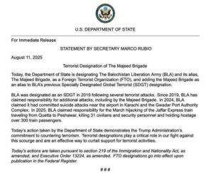 امریکی محکمہ خارجہ نے فتنہ الہندوستان (بی ایل اے) کے مجید بریگیڈ کو غیر ملکی دہشتگرد تنظیم قرار دیدیا۔