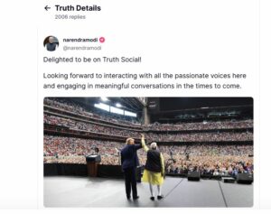 In his first post on Truth Social, Narendra Modi shared a picture with his “good friend” US President Trump. In the caption of the picture, he wrote, “I am very happy to be on Truth Social, and here I look forward to connecting with all the enthusiastic voices and having meaningful conversations in the times to come.”