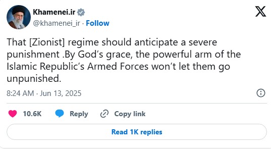Iran’s Supreme Leader emphasized that Iran’s armed forces will respond to this aggression, and warned Israel to prepare for the consequences.